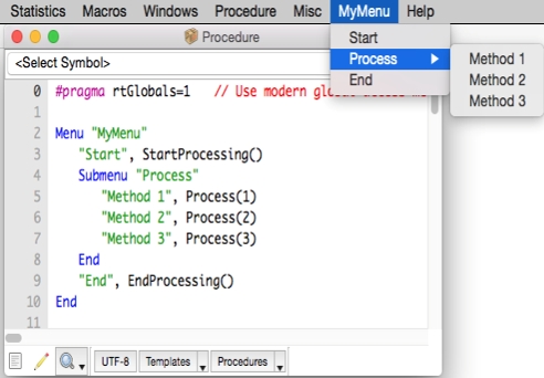 您指定尚不存在的菜單名稱,就可以在菜單欄上添加新菜單(它們將顯示在常規(guī)Igor菜單之后但在Help菜單之前)。您也可以添加子菜單: